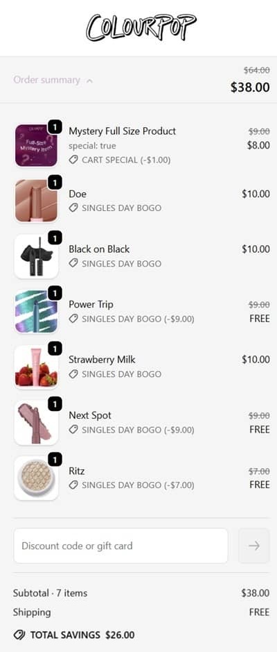 Add 2 eligible ColourPop Lip or Eye Singles to cart and the lowest priced one will become FREE. FREE SHIPPING applies to orders $35+. Excludes sale items. Other exclusions may apply. Take a look at our other favorite finds!