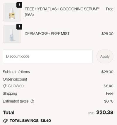 A FULL SIZE freebie and FREE SHIPPING with any order Besties! Snag a FREE DERMAFLASH Hydraflash Cocooning Serum, a $68 value, with EVERY purchase! PLUS you’ll save 30% OFF sitewide during the Black Friday Sale Event! Check out our example cart below!