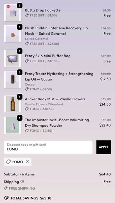 Use the FENTY Beauty coupon code FOMO to add the discount to cart. You will be prompted to add your FREE gifts once your order qualifies. Sign in to your account for FREE SHIPPING. Excludes Dew N Plump Hydrating Nectar Face Mist, Shake ’N Play Buildable Liquid Blush, Allover Body Mist in Tropic Trip, and sets. Other exclusions may apply. Take a look at our other favorite finds!