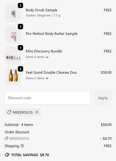 This freebie is perfect for your to go bag! Enjoy a FREE Josie Maran Mini Discovery Bundle with any $50 purchase WHILE SUPPLIES LAST! Including 6 deluxe samples of bestsellers like the Pineapple Enzyme Cleanser, Vanilla Vibezzz Body Butter, Golden Hour Pure Argan Oil, and more! You’ll even choose 2 MORE FREE samples in cart! PLUS use the code MISSYOU15 to save 15% OFF your purchase!