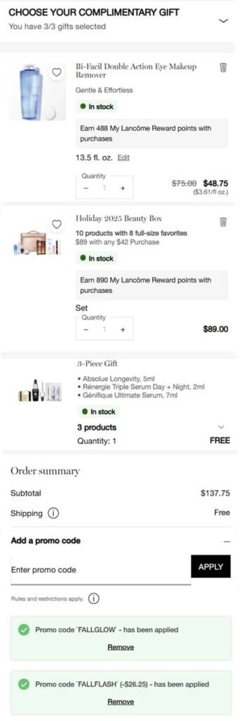 It’s back! Score the 2025 Holiday Beauty Box, a $534 value, for only $89 with any $42 purchase WHILE SUPPLIES LAST! Included inside: the Idôle Café Crush Eyeshadow Palette, FULL SIZE Bi-Facil Eye Makeup Remover, FULL SIZE Crème Radiance Cleanser, FULL SIZE Génifique Ultimate Serum, and so much more! Take a look at our example cart below!