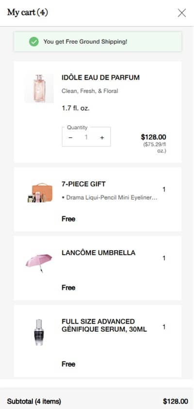 - FREE 7 Piece Gift + FREE Umbrella + FREE FULL SIZE Advanced Génifique Serum with any $125 purchase