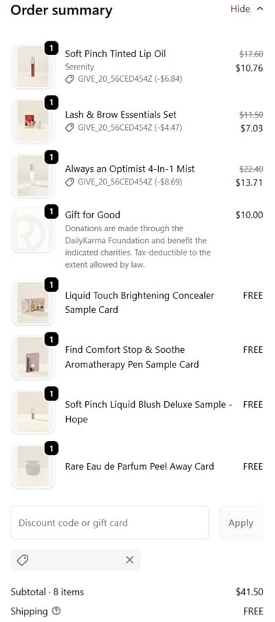 LAST CALL Besties! We’ve got stacking savings you won’t want to miss! Take 20% OFF sitewide during the Rare Beauty Cyber Week Sale Event! PLUS enjoy $20 OFF your $50 order when you donate $10 to the Rare Impact Fund! The Find Comfort Collection is 50% OFF so grab your essentials along with new shades of the fan favorite Soft Pinch Liquid Blush! Check out our example cart below!