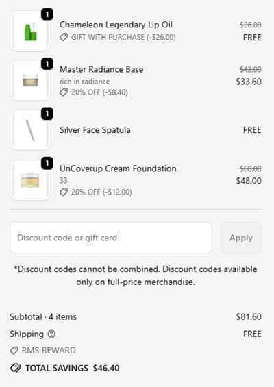 Add to cart Besties! This offer is going, going, almost gone! Today is the LAST DAY to save 20% OFF your RMS Beauty favorites! PLUS receive a FREE FULL SIZE Chameleon Lip Oil, a $26 value with any $ purchase! Level up your clean beauty game with a new shade of the bestselling Legendary Lip Oil or wake up those tired eyes by adding the ReFresh Eye Brightener to your skincare routine!