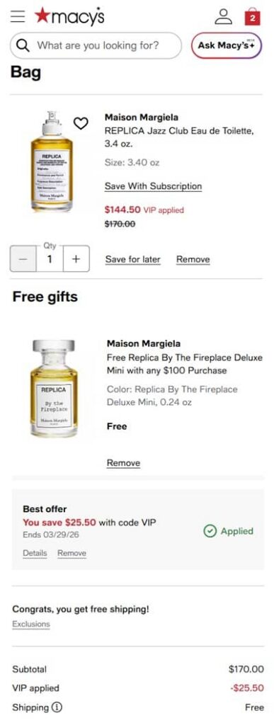 Use the Macy’s VIP coupon code VIP to add the discount to cart. Macy’s Star Rewards members (free to join) enjoy FREE SHIPPING on orders $39+ or choose FREE in store pick up if available in your area. FREE SHIPPING applies to orders $49+ for non-members. Excludes Augustinus Bader and Chanel. Other exclusions may apply. Take a look at our other favorite finds!