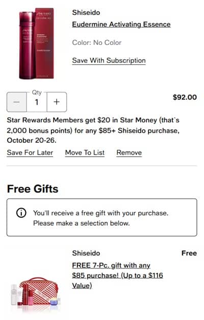 Membership has it’s perks! Macy’s Star Rewards members (free to join) receive $20 in Star Money (that’s 2,000 bonus points) for any $85+ Shiseido purchase! To make the deal even sweeter, enjoy a FREE 7 Piece Gift valued at UP TO $117! Check out even more FREE gifts below: