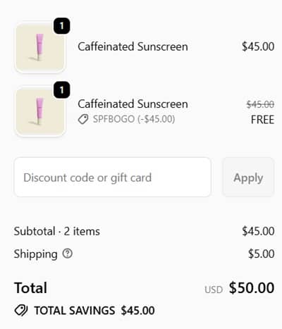 No code needed, add 1 Caffeinated Sunscreen to cart and a second will add for FREE. FREE SHIPPING applies to orders $50+. Shipping for orders less than $50 is only $5. Take a look at our other favorite finds!