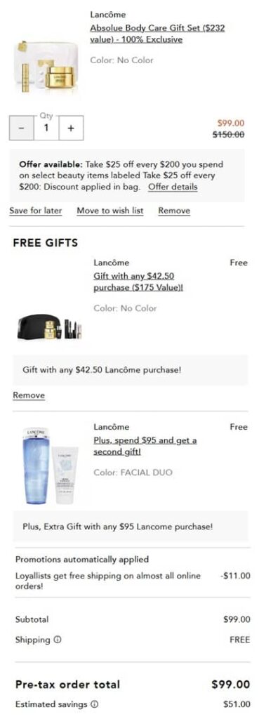 Enjoy a little luxurious self care! TODAY ONLY score the Lancôme Absolue Body Care Set for only $99 with FREE SHIPPING from Bloomingdale’s! Inside you’ll find a FULL SIZE Absolue Soft Body Balm, a $185 value, a deluxe sample of the Absolue The Serum, a Gua Sha Body Tool, and a Signature Bag! PLUS you’ll save $25 off every $200 you spend on select beauty items! Check out our example cart below!