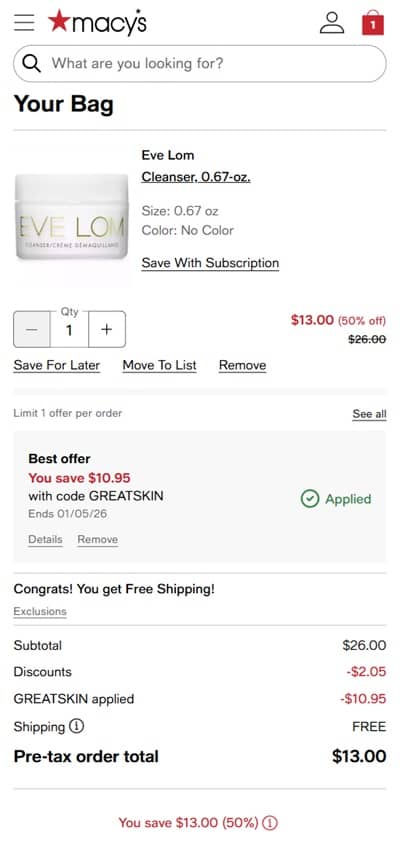 No code needed, eligible items are priced as marked. Use the Macy’s coupon code GREATSKIN for FREE SHIPPING on Macy’s 7 Days of Great Skin items or choose FREE in store pick up if available in your area. Take a look at our other favorite finds!