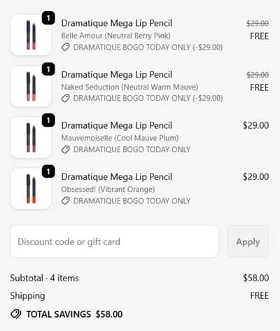 Don’t have FOMO on the lippe BOGO! TODAY ONLY shop Buy 1 Get 1 FREE PAT McGRATH LABS Dramatique Mega Lip Pencils! Ultra rich, creamy texture with a matte finish, from cool mauve to vibrant orange, add what your collection is missing 2 for the price of 1 while you can! You’ll also save 30% OFF on orders $50+, 35% OFF orders $150+, and 40% OFF orders $250+ on everything else!