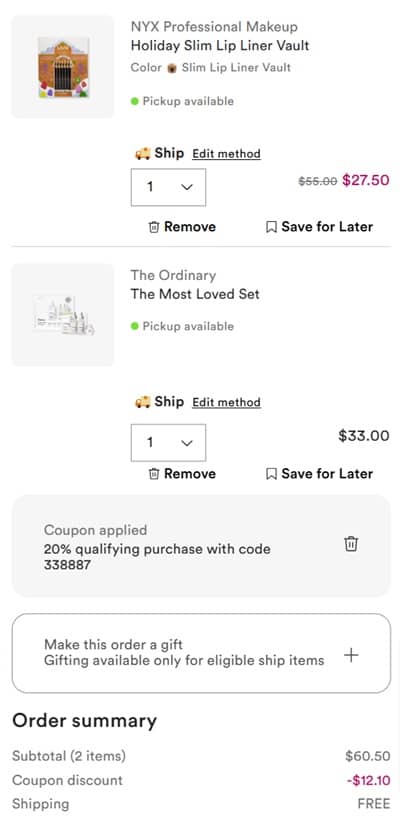 Activate any points multiplier offers you may have available to you. Use the coupon code 338887 to save 20% OFF your non-prestige purchases (exclusions apply*). FREE SHIPPING on orders $25+ for Diamond members and $35+ for everyone else. You can also choose Buy Online, Pick Up In Store (BOPIS) where available. Check out our other favorite Ulta Beauty finds!