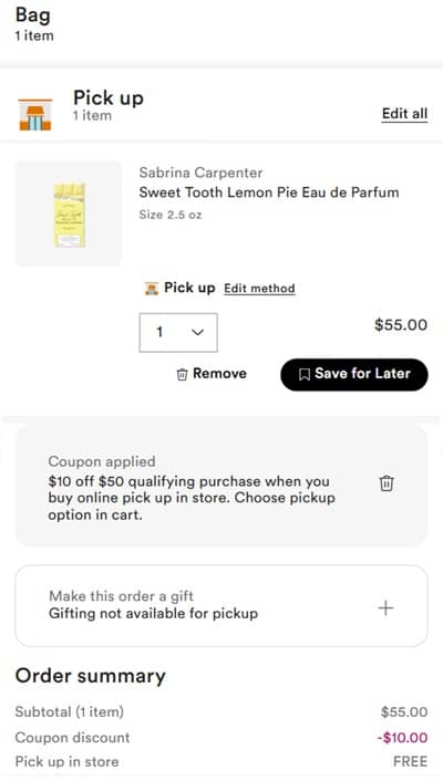 Activate any points multiplier offers you may have available to you. Use the coupon code QUICK to add the Ulta Beauty BOPIS $10 OFF $50 discount to cart. Don’t forget to pickup your purchase within 5 days of your BOPIS order. Check out our other favorite Ulta Beauty deals!