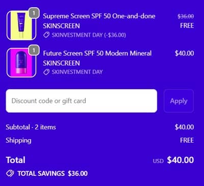 No code needed, add 2 eligible Ultra Violette Skinscreen to cart and the lowest priced one will become FREE. FREE SHIPPING applies to orders $22+. Take a look at our other favorite finds!
